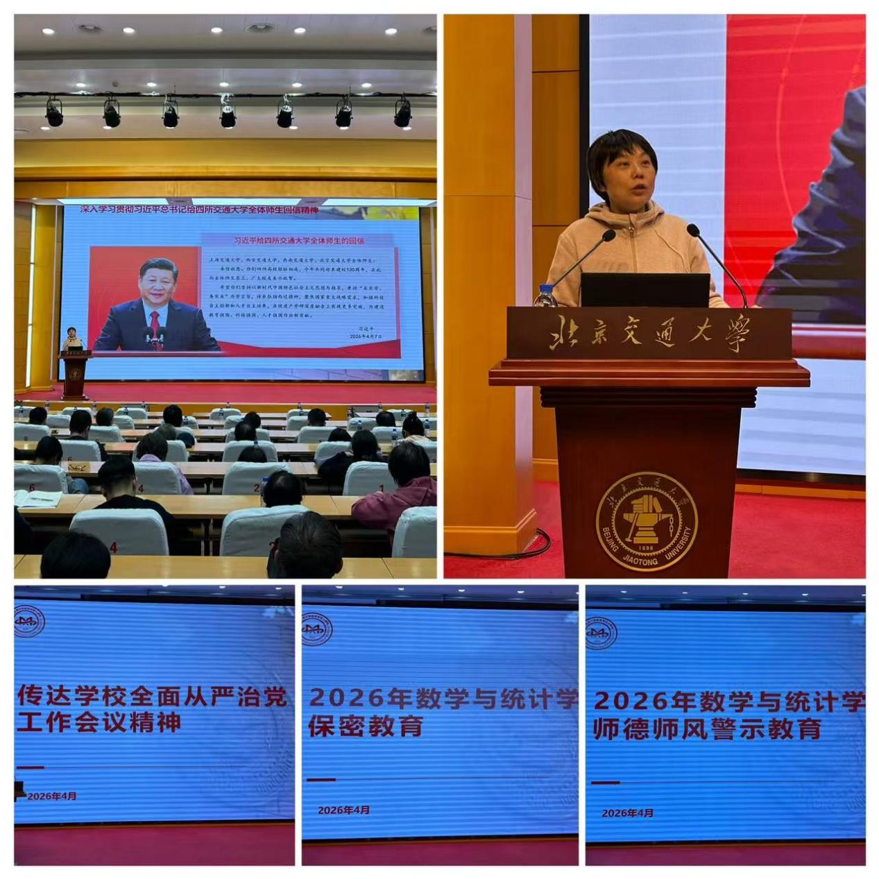 学院党委书记王烜带领全体参会人员重温了习近平总书记给四所交通大学全体师生回信,学习了习近平总书记在河北雄安新区考察重要讲话精神,传达了学校全面从严治党工作会议精神,并开展了师德师风警示教育以及保密宣传教育。她强调,要紧扣学校“双核驱动、立足京津冀、面向世界”发展目标,以雄安校区建设为契机深化改革创新,同时严守安全底线,筑牢意识形态、保密与廉洁自律防线,为学院发展营造风清气正、安全稳定的环境。王烜提出明确要求,一是提高政治站位,深入学习贯彻上级重要指示精神,把思想和行动统一到学校与学院发展上来;二是压实全面从严治党责任,持之以恒正风肃纪,加强廉洁文化建设,营造良好政治生态;三是强化师德师风建设,全体成员争做“四有”好老师;四是严守保密与安全红线,规范使用智能办公工具,防范各类泄密与安全风险,维护学院和谐稳定。