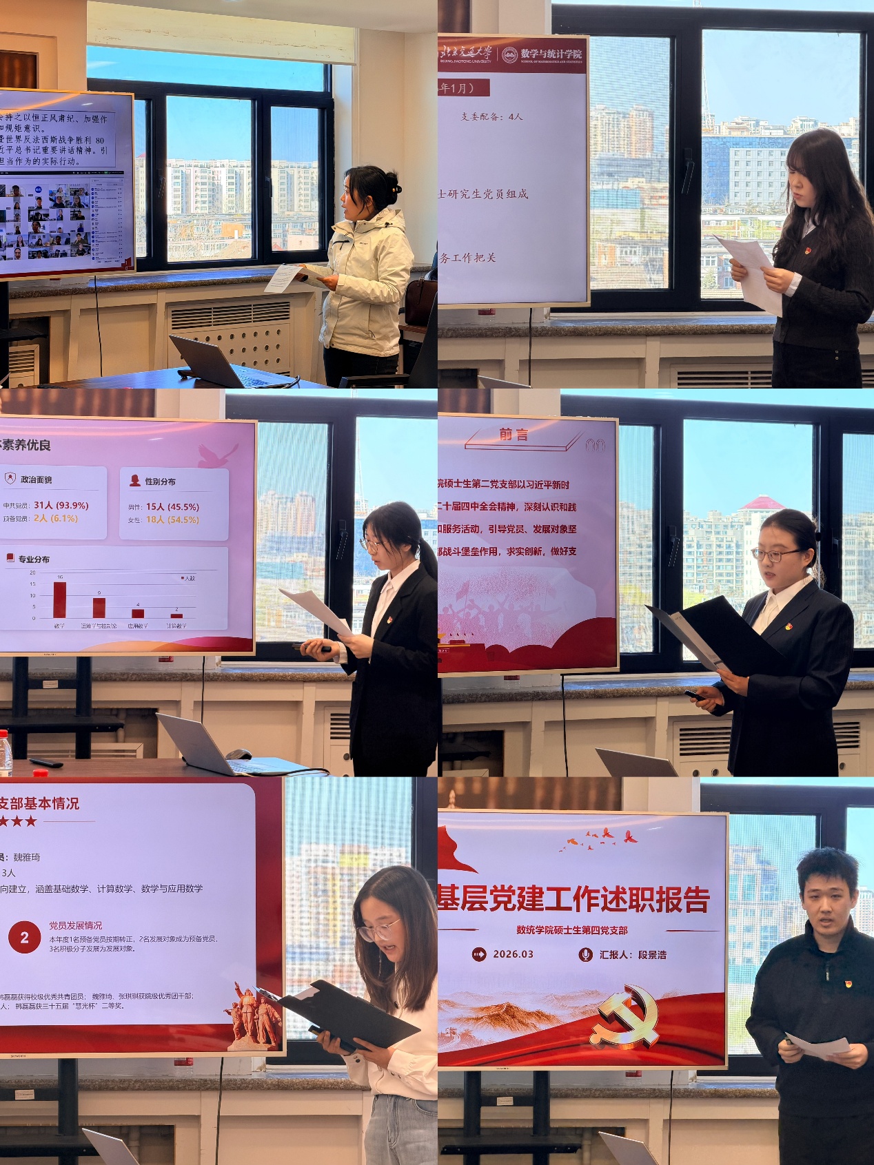 六个研究生党支部围绕党支部标准化规范化建设、深入贯彻中央八项规定精神学习教育开展情况、党员发展和教育管理、年度党建工作任务完成情况、党建品牌建设推进情况等核心内容,全面汇报2025年度支部工作的主要内容和特色做法,总结工作中存在的问题与不足,并结合支部实际明确了下一阶段的工作思路与改进措施。