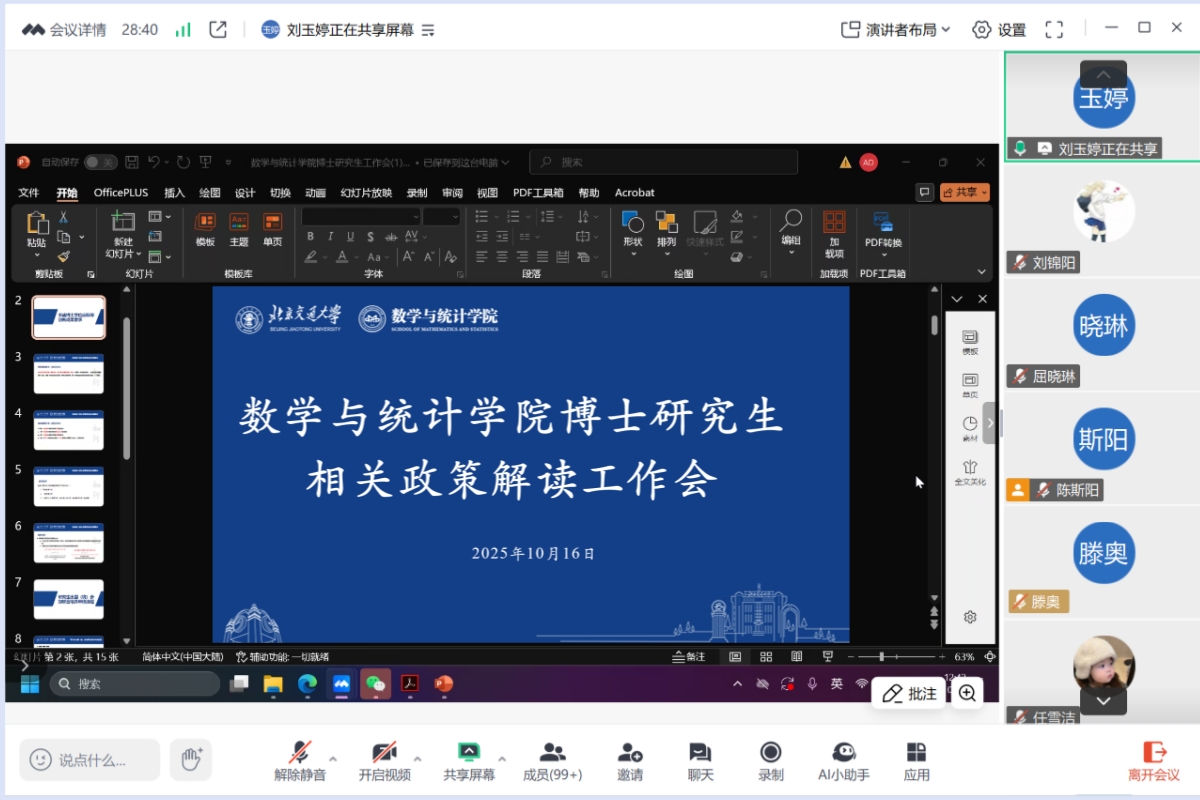 学术规范筑根基,政策解读明路径。10月16日中午,数学统计学院召开线上博士研究生工作会,学院党委副书记、副院长刘玉婷,研究生辅导员陈斯阳,研究生教学秘书屈晓琳及全体博士研究生参会。